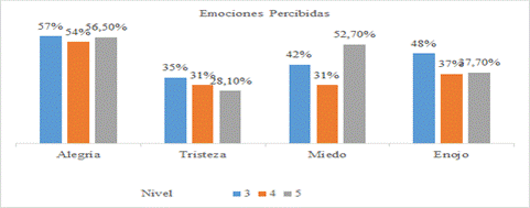 Los datos recabados respecto al reconocimiento de emociones, representan un interesante insumo para la reflexión inter nivel (Figura 4) Más de la mitad de niños y niñas en todas las conversaciones de los tres niveles logran identificar la alegría de forma inmediata, asociada directamente al juego. La implementación de actividades lúdicas en el ámbito de la convivencia familiar y las actividades al aire libre, son elementos que privilegian la expresión de esta emoción, ante los cual, algunos niños y niñas comentan: "Me divertí con los chistes de papá” (N5), “Jugar con mamá y papá” (V3); “Mi papá hacía muchas cosas para ser gracioso” (N4); “Me puso feliz poder ir a la casa de mi abuela” (N4); “Que me pone alegre estar con mis padres” (V4).