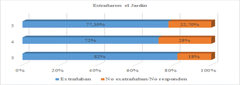 Finalmente, la frecuencia de las percepciones respecto al retorno a las actividades presenciales en el centro educativo, responde a la idea de extrañar y añorar no poder concurrir al centro educativo. En este sentido, todos los niveles reportan respuestas por encima del 70% (Figura 5), “Extrañaba jugar en los toboganes" (V3), “Quería volver al Jardín porque extrañaba a mis amigos” (V5), “Me gustan los muñecos de la escuela” (N4). Inclusive esto también se da, en el nivel 3, a pesar del poco tiempo de asistencia previa antes de la suspensión de la presencialidad.