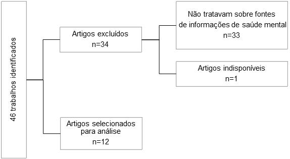 Restaram 12 estudos para serem analisados na íntegra. As informações foram organizadas em duas categorias definidas a priori com base no objetivo do estudo - investigar as FISM utilizadas pelas pessoas, bem como discutir as vantagens e desvantagens associadas a fontes específicas a fim de compreender os motivos de preferências por uma ou outra fonte. Assim, a primeira categoria identifica as FISM utilizadas por grupos específicos de pessoas, enquanto a segunda indica as implicações do uso de determinada fonte, por meio da descrição das vantagens e desvantagens de cada uma.