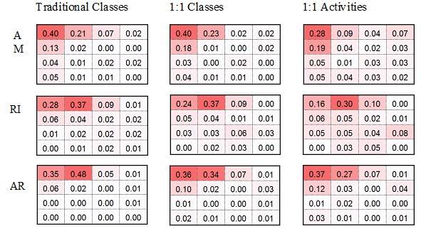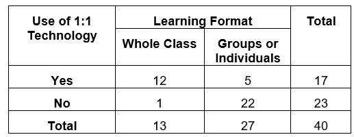 For two of the teachers, we found significant differences in frequencies of interaction types between 1:1 and traditional classes, however, in different directions. AM had suggested much less response opportunities and more non-public interactions in the 1:1 classes compared to the traditional classes (the latter is consistent with her being physically closer to more students during 1:1 activities compared to traditional classes, as mentioned above), while RI demonstrates an opposite pattern, suggesting more response opportunities and having less non-public interactions during 1:1 classes compared to traditional classes. These differences are not in line with a recent study that found no significant difference in teacher-student interaction with the use of iPads (Leslie & Johnson-Leslie, 2013), probably as a result of the analysis enabled by our data granularity.