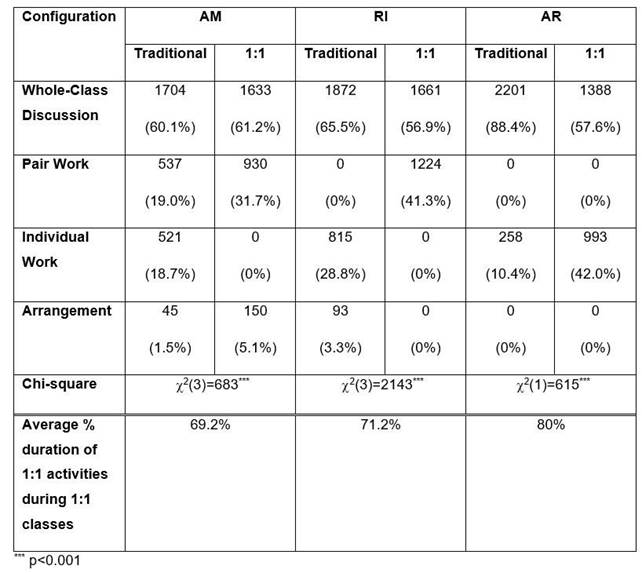 Main Findings. For each teacher-noted here as AM, RI, AR-we compared their own behavior during traditional and 1:1 classes. The average time spent on tablets in 1:1 classes was 69.2% for AM, 71.2% for RI, and 80% for AR.