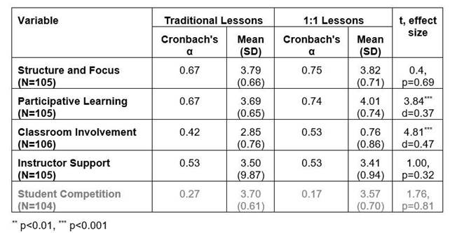 One of the components of CES (student competition) was found to be non-reliable (testing using Cronbach's alpha), therefore was removed from the analysis. Of the remaining components, when comparing 1:1 with traditional lessons, we found that participative learning and classroom involvement were significantly higher in the 1:1 lessons, with medium-high effect sizes, and that no differences were found in structure and focus and in instructor support. Findings are summarized in Table 5. Interestingly, when considering only those teachers who used the computers at the highest frequently ("Almost always", N=27), the structure and focus component was also found significant, with higher mean in the 1:1 lessons (M=4.18, SD=0.53, compared with M=3.91, SD=0.65), with t(26)=2.34, at p<0.05, with a medium-large effect size, Cohen's d=0.45.