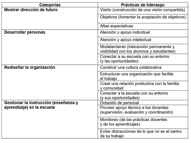 Leithwood y Riehl (2005) desarrollaron un estudio en el que describen diversas áreas de liderazgo de los directores efectivos y las prácticas asociadas (Tabla 1). Estas son: establecer dirección de futuro, desarrollar al personal, rediseñar la organización y gestionar los programas de enseñanza y aprendizaje. Cada una de estas dimensiones se encuentra asociada a prácticas específicas, las que promueven motivación a los docentes, desarrollan nuevas habilidades o capacidades y generan condiciones de trabajo.