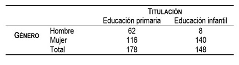 La muestra final la conforman 326 sujetos de diferentes cursos del grado de Magisterio en Educación Infantil y en Educación Primaria que estudian en la Universidad Autónoma de Madrid correspondientes a 10 grupos de clase (5 grupos de cada grado). Concretamente el 54,6% de los estudiantes son de Educación Primaria y el 45,4% de Educación Infantil.