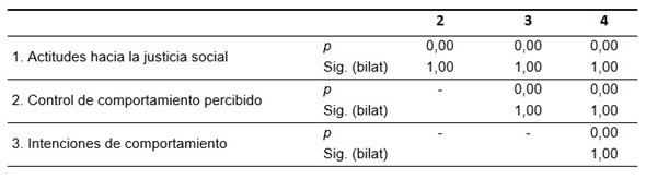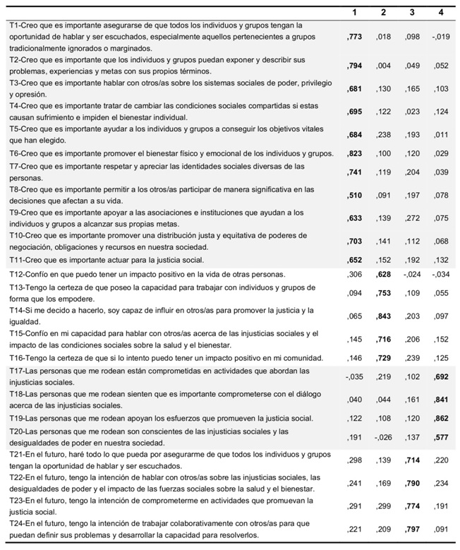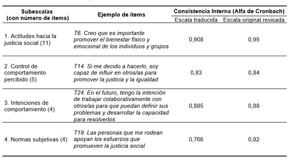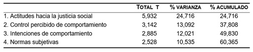 Para estudiar la validez de constructo se llevó a cabo un análisis factorial. La Tabla 2 muestra la matriz de componentes rotados. En coherencia con los resultados obtenidos con la escala original, el análisis factorial detalla la existencia de cuatro subescalas: Actitudes hacia la justicia social, Control de comportamiento percibido, Intenciones de comportamiento y Normas subjetivas. Los ítems que conforman cada categoría son: