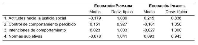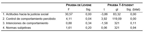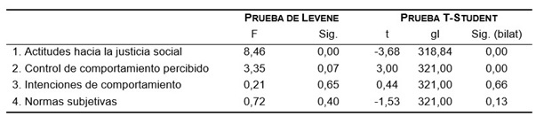 Los valores de estadístico F de la prueba de Levene señalan que las varianzas de los grupos Educación Primaria e Educación Infantil son homogéneas para las subescalas Intenciones de comportamiento (F=0,21) y Normas subjetivas (F=0,72). Por su parte, los resultados ofrecidos por la prueba T-Student muestran que, efectivamente, existen diferencias significativas en función de la titulación que cursan los futuros maestros en relación a las Actitudes hacia la justicia social y el Control del comportamiento percibido.