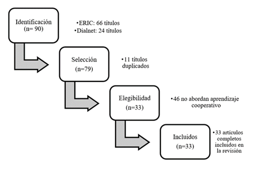 En definitiva, en cuanto a los criterios de inclusión se han tenido en cuenta artículos obtenidos con los descriptores mencionados, publicados en revistas científicas, entre 2009 y 2019 y con acceso a texto completo. Por lo que respecta a los criterios de exclusión, se eliminan del análisis publicaciones que no son artículos (tesis, capítulos de libros, etc.), artículos teóricos (salvo revisiones sistemáticas o artículos de alto impacto), aquellos que no aborden específicamente el aprendizaje cooperativo como metodología inclusiva y los artículos duplicados.