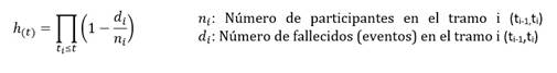 Sin embargo, luego de haber ordenado crecientemente los tiempos a que se producen los eventos, el método de Kaplan-Meier permite calcular la función de impacto de la siguiente manera (Rodríguez Barranco, 2017, p. 10): ch8