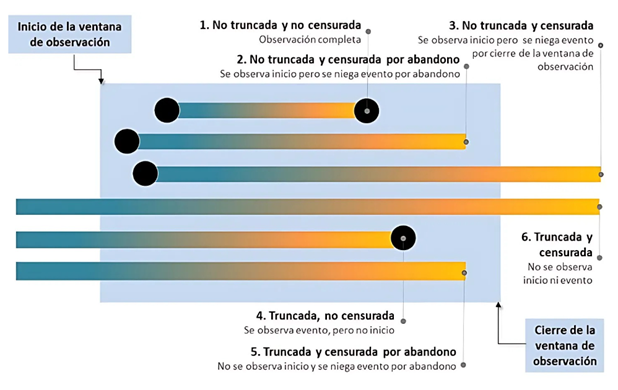 - No se observa el inicio por truncamiento y se niega el evento por censura por derecha. La trayectoria se ha visto truncada y también censurada por derecha. La trayectoria comienza con anterioridad al tiempo 0 y finaliza la ventana de observación sin que se observe el evento (información vectorial incompleta, pero se niega el evento por el cierre de la ventana de observación).