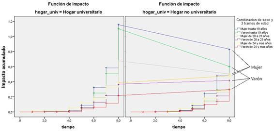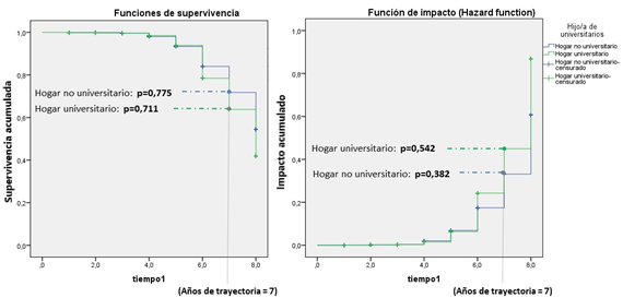 Complementariamente, el hecho de que la función de supervivencia para los estudiantes provenientes de hogares universitarios al séptimo año de cursado fuera p=0,711 y la función de impacto de p=0,542 significa que la probabilidad de que un estudiante proveniente de un hogar universitario no obtenga el título habilitante antes de los siete años es del 71,1 % y que la probabilidad de que al menos un estudiante obtenga el título habilitante dentro de los primeros siete años es del 52,4 % (Figura 2).