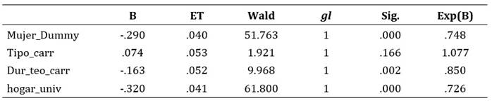 Con base en los valores de significación obtenidos (Tabla 1), para las variables sexo al nacer (Sexo_cod), duración teórica de la carrera (Dur_teo_carr) y máximo nivel educativo alcanzado en el hogar del estudiante (hogar_univ), existe suficiente evidencia para rechazar la hipótesis nula de que los coeficientes no difieren significativamente de cero. Sin embargo, esto no se observó en el caso de la variable tipo de carrera (Tipo_carr), cuyo valor p (Sig.=0,166) no es menor a 0,05.