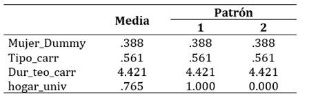 Complementariamente, la variable hogar_univ muestra una variación significativa entre los patrones (Tabla 2): entre los estudiantes que tienen al menos un universitario en su hogar y aquellos que no tienen universitarios en su hogar.