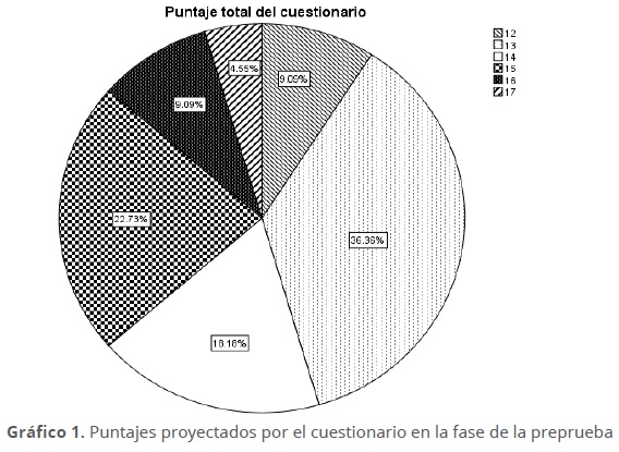 El puntaje total del cuestionario fue de 24 puntos. De estos la muestra proyectó un puntaje situado en el intervalo de 12-17 puntos en el que el 9.09% obtuvo 12 puntos, el 36.36% 13 puntos, el 18.18% 14 puntos, el 22.73% 15 puntos, el 9.09% 16 puntos y, finalmente, solo el 4.55% obtuvo máximo puntaje del intervalo referido, es decir, 17 puntos. Con base en lo anterior, el puntaje fluctúa en el 50% con respecto al puntaje total del cuestionario. Tales resultados denotan el bajo desarrollo de habilidades cognitivas y dificultades para el manejo y solución de la adición y sustracción de fracciones comunes presentes en la muestra.