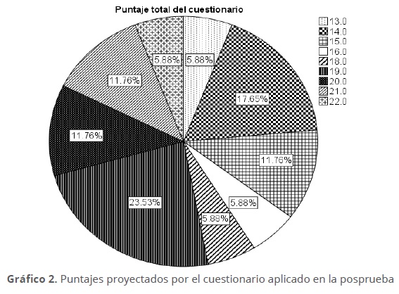 Al analizar los datos proyectados por el total de los ítems, dimensiones y variables contemplados en el instrumento de medición, se encontró que los puntajes se inscriben en un rango que fluctúa entre 13 y 22. Con ello es posible señalar que el rango de puntuación del instrumento osciló entre 2 y 24 puntos. Los puntajes más altos con respecto a la preprueba son de 18, 19, 20, 21 y 22 con porcentajes de 5.88%, 23.53%, 11.76%, 11.76 y 5.88% respectivamente. Con base en este rango de puntajes y porcentajes es posible señalar una mejora importante en las dimensiones y variables medidas.