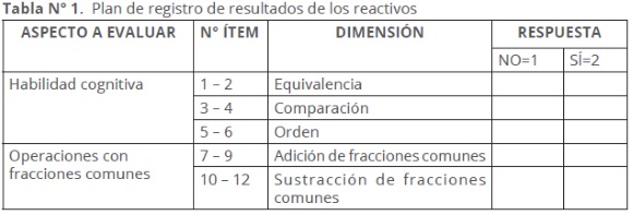 Tanto en la fase de preprueba como en la de posprueba se aplicaron dos instrumentos: un cuestionario y una Escala Likert. El cuestionario consideró un total de 12 reactivos: 6 para recabar datos concernientes a las habilidades cognitivas, 2 para cada habilidad. El puntaje total del instrumento correspondió a 24 puntos: 1 punto para la respuesta incorrecta y 2 puntos para la respuesta correcta. Los reactivos de este apartado contemplaron ejercicios que demandaban al alumno el manejo de fracciones comunes y la colocación de un dígito o fracción según correspondiese, siempre cuidando el cumplimiento de condiciones demandas por los signos =, > y < (igual que, mayor que y menor que), es decir, para establecer la equivalencia, comparar y ordenar fracciones. Los 6 reactivos restantes se distribuyeron equitativamente para la adición y sustracción de fracciones comunes. Los mismos demandaron al alumno la colocación de un digito para completar la fracción correcta o en su caso los dígitos que conforman una fracción, la colocación del denominador o numerador o en su caso ambos que cumpliese la condición.