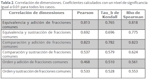 La correlación entre las dimensiones ordenar fracciones comunes y adición de fracciones comunes, así como entre las dimensiones ordenar fracciones comunes y sustracción de fracciones comunes, es débil. Aunque la correlación estadísticamente es diferente a cero, esta no alcanzó el nivel de significancia con ninguno de los estadísticos aplicados. El comportamiento de estos datos impide aceptar la hipótesis de investigación sin margen de error.
