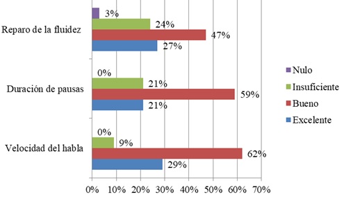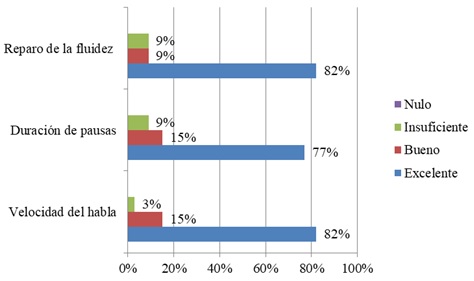 Esta dimensión se divide en tres criterios y serán expuestos en el siguiente orden: Velocidad del habla, Duración de las pausas y Reparo de la fluidez.