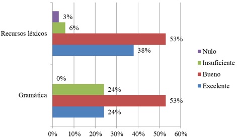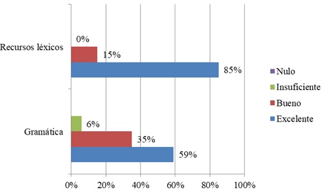 Esta dimensión se divide en dos criterios: Gramática y Recursos léxicos. En el criterio Gramática, en el Test de desempeño oral inicial el 24 % de los estudiantes obtuvo un nivel de desempeño Excelente, mientras que el 53 % obtuvo un nivel Bueno (Ver Figura 3). En el Test de desempeño oral final, 59 % de los estudiantes obtuvo un nivel Excelente mientras que el 35 % de los estudiantes obtuvo un nivel Bueno (Ver Figura 4). En relación con el criterio de Recursos léxicos, en la pre-intervención (Ver Figura 3), el 38 % de los estudiantes obtuvo un nivel de desempeño Excelente y el 53 % del estudiantado se ubicó en un nivel de desempeño Bueno. En la post-intervención (Ver Figura 4), el 85 % de los estudiantes fue evaluado como Excelente y el 15 % como Bueno.