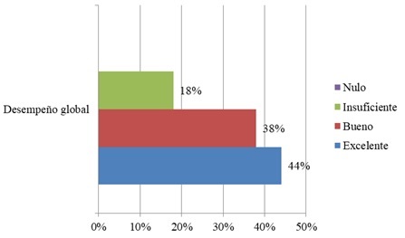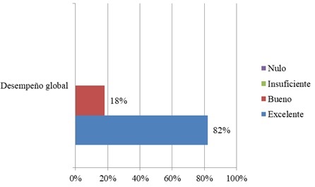 Con respecto a la dimensión de Desempeño global, por una parte en el Test de desempeño oral inicial (Ver Figura 5) el 44 % del estudiantado obtuvo un nivel de desempeño Excelente, el 38 % alcanzó un nivel de desempeño Bueno y el 18 % obtuvo un nivel Insuficiente. Por otra parte, en el Test de desempeño oral final el 82 % del estudiantado obtuvo un nivel Excelente y el 18 % un nivel Bueno (Ver Figura 6).