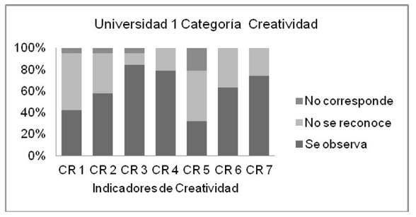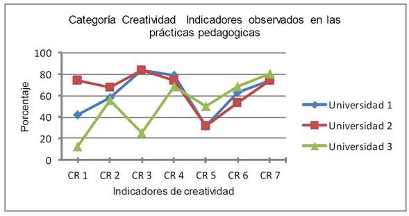 Finalmente, para obtener una visión comparativa de la acción docente en las tres universidades de la muestra se consideró oportuno analizar la frecuencia de los indicadores de creatividad observados en las prácticas pedagógicas vinculada, dicha frecuencia, al enfoque de la transposición didáctica.