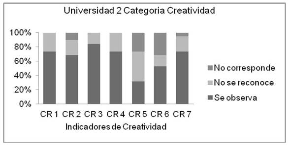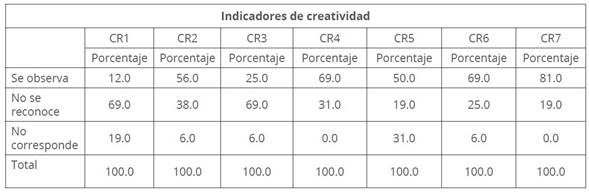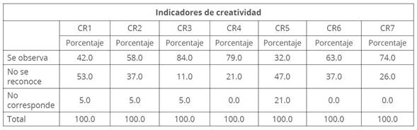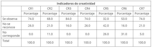 Finalmente cabe advertir que en las aulas universitarias -ya sea por el elevado número de estudiantes o por su infraestructura inadecuada- el trabajo colaborativo se ve limitado o es imposible desarrollarlo. Esto puede impedir la manifestación y, por lo tanto, la observación de determinados indicadores de creatividad. En esta misma línea, De la Torre y Violant (2013) se refieren al carácter colaborativo o compartido del conocimiento en el que se puede confrontar la información favoreciendo la enseñanza creativa. Por dicha razón no fueron considerados indicadores asociados al trabajo grupal facilitador de una expresión creativa.