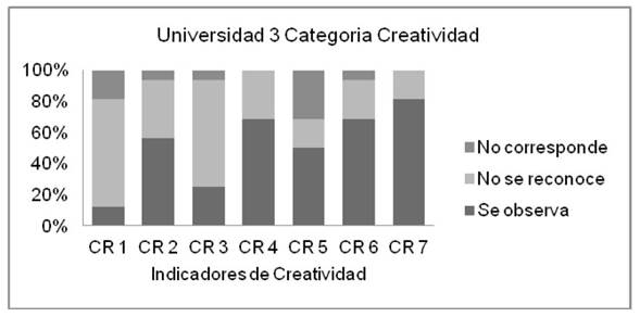 Los sujetos de la universidad 3 en muy pocas ocasiones plantean preguntas divergentes (25%). Esto contrasta con lo que ocurre en las universidades 1 y 2 donde el 84% de los docentes de ambas universidades plantean desafíos y preguntas divergentes a sus estudiantes, situación asociada a este indicador de creatividad observado (véase Figura 4) donde es posible reconocer elementos asociados a una eventual transposición didáctica del docente universitario. Por cierto esta situación permite afirmar que, en algunas ocasiones, el sistema universitario y los aspectos externos pueden favorecer o dificultar la puesta en marcha de acciones educativas que fomenten y potencien la creatividad de su alumnado en la universidad.