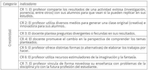 Posteriormente esta pauta de observación de clase fue validada por cinco jueces expertos en evaluación educacional y psicometría (dos psicólogos y tres profesores evaluadores de universidades externas a la muestra consultada) quienes juzgaron la pertinencia de los ítems así como la aplicabilidad y la claridad de su redacción. Se conformó una lista definitiva de siete indicadores. Estos reactivos asociados a los indicadores de creatividad que pueden reconocerse en las prácticas docentes se presentan en la siguiente Tabla 2.