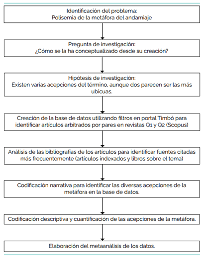 La elección del metaanálisis como metodología de investigación se justifica en la pregunta guía: ¿cómo ha evolucionado la metáfora del andamiaje y qué acepciones se le han dado en la práctica de enseñanza en contextos formales? A partir de esta interrogante, se planteó la hipótesis de que dicha metáfora puede ser comprendida y ha sido interpretada en la literatura educativa de varias formas, aunque se destacan dos principales. Por un lado, se la ve como una herramienta mediacional orientada a la coconstrucción de aprendizajes entre docentes y estudiantes. Por otro lado, debido a la definición original del constructo más frecuentemente citada (Wood, et al., 1976), se la ve como una intervención docente orientada exclusivamente a la resolución de tareas o problemas. Entonces, resultó pertinente analizar cómo las conceptualizaciones de la metáfora del andamiaje han evolucionado desde su creación hasta tiempos recientes. Para ello, analizar lo emanado de investigaciones y publicado en torno a dicha metáfora coadyuva a comprender cómo el constructo es no solamente entendido, sino también cómo se lo ha actualizado.