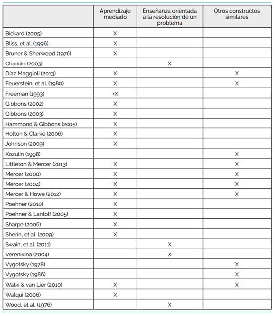 Siete de las publicaciones establecen una diferenciación entre la metáfora del andamiaje y otros constructos similares, entre los cuales se destacan el concepto de Zona de Desarrollo Próximo (Vygotsky, 1978; Feuerstein et al., 1980; Kozulin, 1998; Díaz Maggioli, 2013), la Zona de Desarrollo Intermental (Littleton & Mercer, 2013; Mercer, 2012, 2004) o la Evaluación Dinámica (Poehner & Lantolf, 2005; Poehner, 2010).