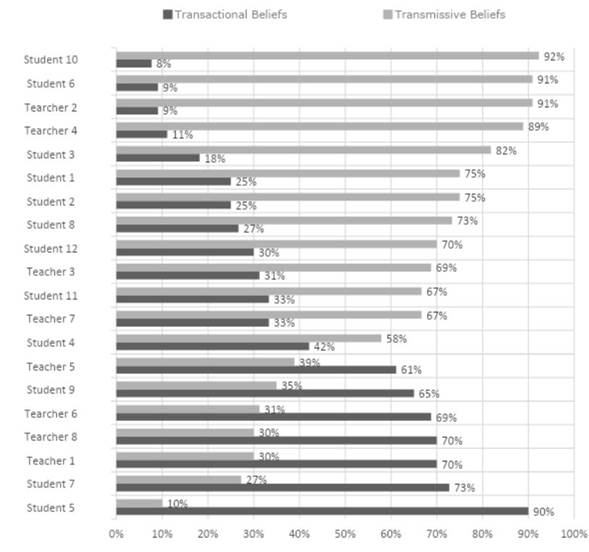 According to transmissive beliefs, reading and writing are individual processes where the reader must understand what the text says (using different techniques, such as extracting main and secondary ideas from the text), and the writer must be as neutral as possible when transmitting a message. Therefore, they conceive reading and writing as general tools that can be used in any context. On the contrary, those with a greater load of transactional beliefs understand reading and writing as dialogic, creative, and meaning-building processes. From this perspective, writing can be a teaching and learning tool since, through the writing process, it is possible to organize ideas, solve problems and make decisions. Regardless of beliefs, similar practices can be identified; however, transactional beliefs correspond to reading and writing practices that are more critical and meta-reflective.