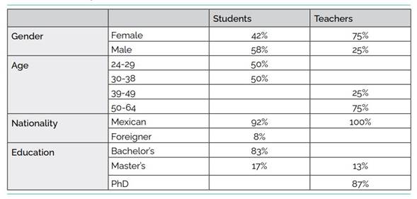 We worked with volunteer subjects from a master's program in Architecture at a public university in Veracruz, Mexico. Collaborating members were 20 in total: 12 students (4 eighth generation and 8 ninth generation) and 8 full-time teachers. Table 1 provides more details on participants.