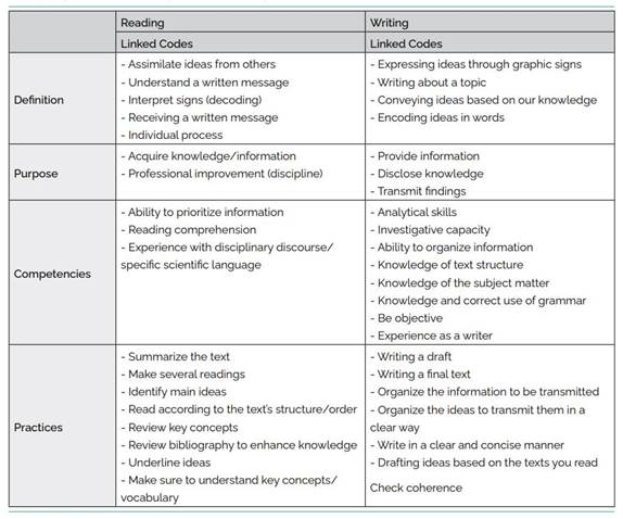 In both cases, it is emphasized that there is already a general idea of what is to be transmitted, namely, there is already a script or writing objective. As observed, the practices of reading, writing, and speaking, in the academic context, are interwoven with each other.