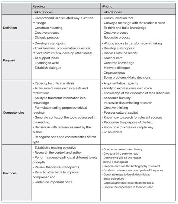 The reading and writing practices examined in this paper are primarily transactional in nature, focusing on aspects such as goal setting, defining a position, inquiring about the author's context, and determining who the reader will be. In other words, they are practices that imply a meta-reflection on what and why one reads and writes, which is inextricably linked to the ways of doing things in a particular academic community. In this sense, it is essential to consider the epistemic nature of reading and writing in the academic context since, as Cassany (2006) points out, reading and writing are recursive processes that involve contrasting and organizing information, ideas, authors, reviewing, re-contrasting and re-reading. This can be corroborated by what teachers and students state about their reading practices, for example: reading other sources to understand a text better; reviewing the bibliography of the text being read to understand the author's position; or conversing with classmates about what they have read, that is, externalizing what they have read in order to learn. In addition, practices in terms of writing include reviewing notes while writing or reading other texts to go deeper into a specific idea and marking the text with different colors in each revision to organize the information coherently. Thus, teachers and students not only read and write to research and generate innovative contributions to their disciplinary field but also learn, converse and develop a position through these practices.