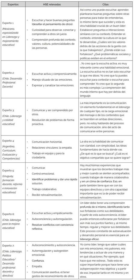 Los hallazgos del estudio muestran convergencias en las voces de los expertos respecto a la relevancia de las HSE. Todos reconocen una variedad de HSE relevantes en el ejercicio del liderazgo pedagógico con una potencial influencia en el DPD.