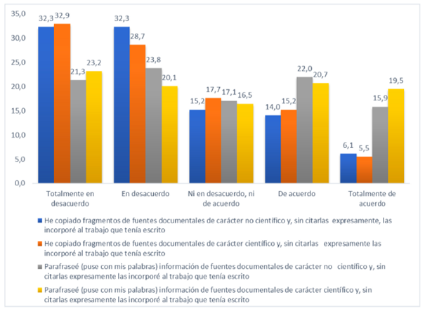 Con respecto a las actividades de plagio durante la formación profesional, como se puede ver en la Figura 1, el 32,3 % de los encuestados manifestó estar en total desacuerdo con respecto a la copia de fragmentos de fuentes no científicas, mientras que solo el 6,1 % expresó estar totalmente de acuerdo. En relación con la copia de fuentes científicas, el 32,9 % indicó estar en total desacuerdo, mientras que el 5,5 % señaló estar totalmente de acuerdo. En cuanto al parafraseo de fuentes documentales no científicas, el 21,3 % manifestó estar en total desacuerdo y el 15,9 % indicó estar totalmente de acuerdo. De manera similar, el 23,2 % expresó estar en total desacuerdo con el parafraseo de fuentes científicas, mientras que el 19,5 % manifestó estar en total acuerdo. En consecuencia, se observa que los estudiantes universitarios encuestados presentan malas prácticas en la citación y parafraseo tanto de fuentes científicas como no científicas.