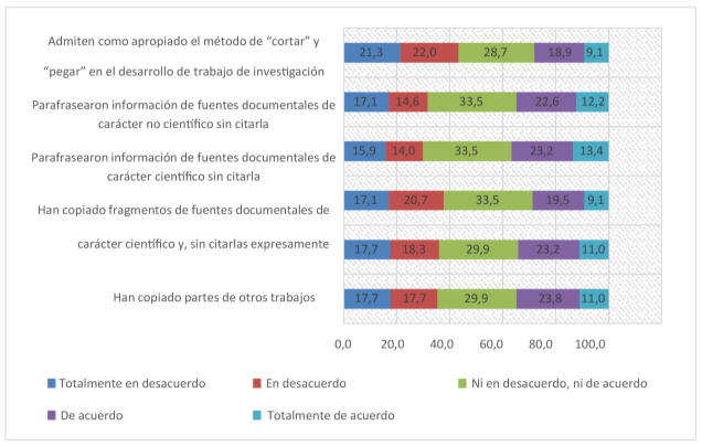 En cuanto a las actividades de plagio durante la formación profesional, el 32,9 % de los estudiantes expresaron su total desacuerdo en relación al copiado de fuentes de información científica sin citación específica al elaborar sus trabajos académicos, pero según los hallazgos de Villacreses (2021), el 53,7 % de los estudiantes consideran el plagio académico como una acción desfavorable para el aprendizaje debido a los hábitos de estudio inadecuados. El plagio es un grave error científico que requiere una discusión con estudiantes y jóvenes investigadores.