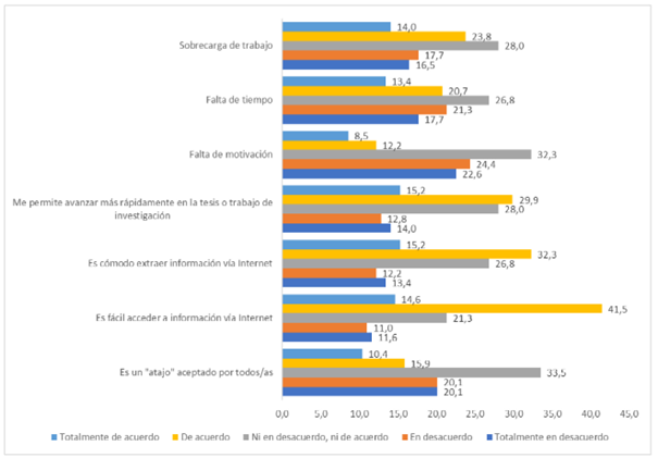 Como se ve en la Figura 4, el 23.8 % de los encuestados señalaron que la sobrecarga de trabajos en la universidad es una causa del plagio académico; el 20.7 % mencionó la falta de tiempo; el 12.2 %, la falta de motivación. Además, el 29.9 % determinó que plagiar les permite avanzar en su trabajo de manera rápida; el 32.3 % indicó que resulta cómodo obtener información de internet y el 41 % manifestó que es fácil acceder a todo tipo de información en línea. En consecuencia, los estudiantes universitarios racionalizan el acto de copiar sin citar a los autores, fundamentándose en una mezcla de desafíos estructurales del entorno académico y actitudes personales hacia el aprendizaje y la utilización de recursos digitales.
