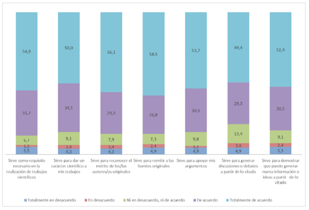 En relación con la utilidad y la importancia de las fuentes referenciadas en los trabajos científicos, más del 50 % de los participantes manifestaron su acuerdo con esta práctica. Por otro lado, Zamora-Uribe (2019) reveló que el 95,8 % de los estudiantes encuestados perciben el plagio como una conducta inapropiada, mientras que el 98,6 % lo reconoce como un acto fraudulento que conduce a la deshonestidad. Estos hallazgos indican que los estudiantes universitarios comprenden el concepto de plagio académico y el valor de atribuir la autoría. No obstante, persiste la publicación de artículos académicos con un alto grado de similitud, lo que subraya la necesidad de que los estudiantes comprendan que el plagio no solo es una práctica de investigación deficiente, sino también ilegal.