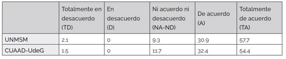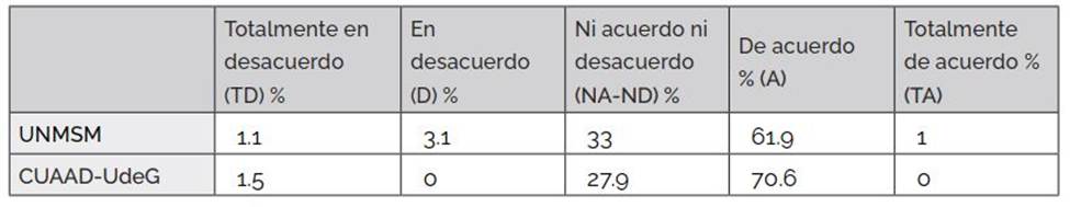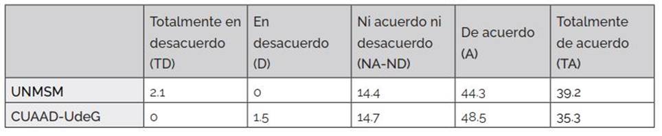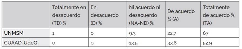 La UNMSM (85.6 %) y el CUAAD-UdeG (92.7 %) coinciden en que las tecnologías digitales aceleran y dan acceso automatizado a la información, mejorando la productividad y calidad de vida. Encuentran una alta interrelación entre la aplicación de tecnología digital y la calidad en la educación superior, UNMSM (79.3 %), CUAAD-UdeG (75 %), y tienen un nivel alto de conciencia sobre la tecnología digital y sus efectos en la economía (81.4 %) y (92.7 %) en donde el CUAAD-UdeG lo relaciona mucho más.
