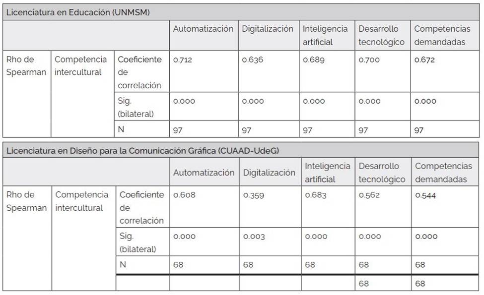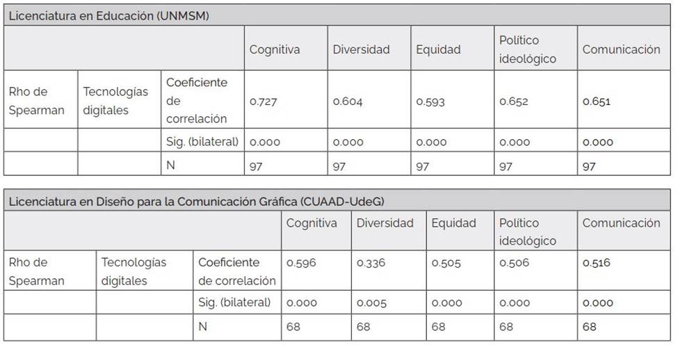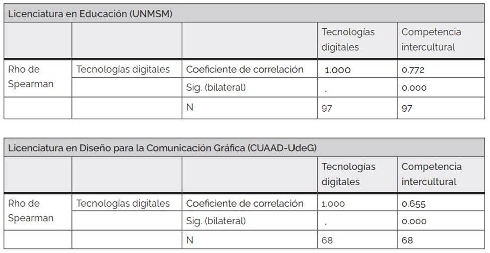 Existe correlación entre las variables de las tecnologías digitales y las dimensiones de la competencia intercultural. En la UNMSM, la correlación de las tecnologías digitales con la dimensión cognitiva es de 0.727, con lo político ideológico 0.652, y con comunicación 0.651. En el CUAAD-UdeG, la correlación de las tecnologías digitales con la dimensión cognitiva es de 0.596, con lo político ideológico es de 0.506 y con comunicación es de 0.516. En ambas universidades el p-valor es 0.000 <0.05, lo que expresa la significación de la percepción de los estudiantes, sobre la incidencia de las tecnologías digitales en cada dimensión de la competencia intercultural. Se observa una diferencia más alta en la UNMSM que en el CUAAD-UdeG, aunque ambas son de nivel moderado y positivo.