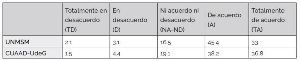 En la Tabla 7 se evidencia que los estudiantes del CUAAD-UdeG no están tan seguros de que el currículo universitario incorpore los cambios tecnológicos que demanda el mercado laboral, en parte se puede considerar porque un 38 % de los encuestados pertenecen al plan de estudios saliente en que aún conservaba ocho semestres de técnicas de ilustración, con un 10 % en desacuerdo; los estudiantes de educación también presentan un porcentaje bajo que suma 12.3 %, del cual un 4.1 % se manifiesta totalmente en desacuerdo.