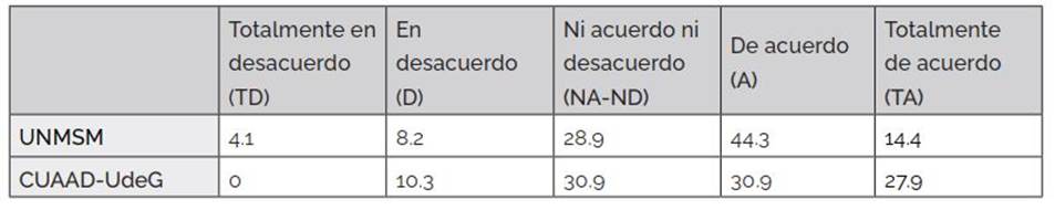 De acuerdo con la Tabla 8, en la UNMSM, consideran 83.5 % que las tecnologías digitales desarrollan competencias procedimentales en la formación integral del docente, mientras que se presenta un 83.8 % en CUAAD-UdeG, ya que cada año se proporcionan diversos cursos para docentes relacionados con la tecnología, como: inteligencia artificial en la educación, el futuro de la enseñanza; gestión de la información; modelación digital en formato BIM para la representación arquitectónica; integrando IA en la educación, herramientas innovadoras para el aula. Existe una diferencia mínima entre las dos universidades.