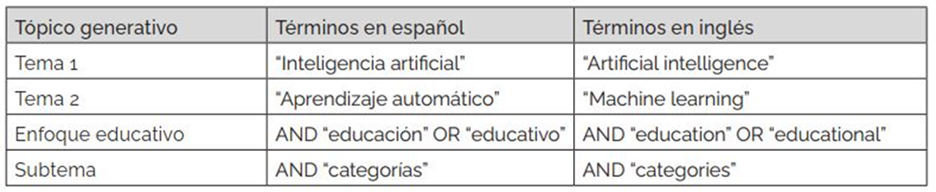 Para el diseño de estas ecuaciones de búsqueda nos basamos en los aportes y recomendaciones de Zawacki-Richter et al. (2020) para el caso de revisiones sistemáticas en investigación educativa, también en los aportes y recomendaciones de Marín (2022) para el desarrollo de estudios en el campo de tecnología educativa. Asimismo, tomamos como referencia las ecuaciones de búsqueda aplicadas en algunas investigaciones recientes que también realizaron una revisión sistemática en el ámbito de la IA y educación, el más significativo y actual es el caso del estudio de Forero-Corba & Negre (2024).