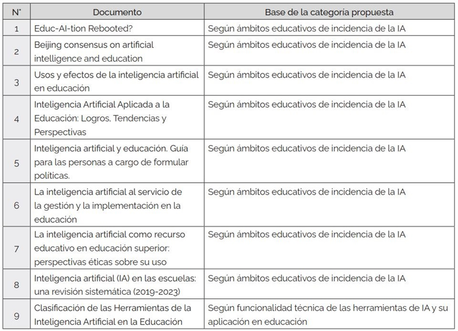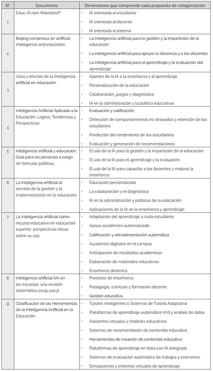 Por su parte, los documentos “Inteligencia artificial (IA) en las escuelas: una revisión sistemática (2019-2023)” (Bustamante & Camacho, 2024) y “Beijing consensus on artificial intelligence and education” (UNESCO, 2019) también presentan categorías con características similares a las citadas anteriormente. Cuatro documentos presentaron una propuesta de categorización constituida por tres dimensiones y, tal como puede observarse (ver en Tabla 5 los documentos n.° 1, 2, 5 y 8), son dimensiones bastante amplias o generalistas.