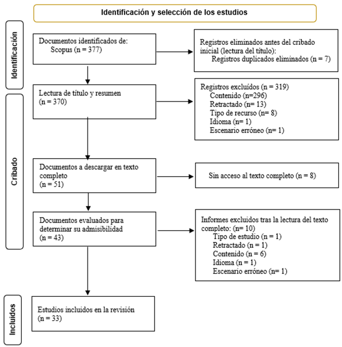Para la búsqueda se seleccionó la base de datos Scopus, una de las principales bases de datos de alto prestigio y con un amplio número de revistas indexadas (Khando et al., 2023). Las palabras clave fueron “artificial intelligence”, “AI”, “higher education”, “university”, “college”, “master students” y “doctorate students”. La cadena de búsqueda fue la siguiente: (TITLE (ai) OR TITLE (“artificial intelligence”) AND TITLE (“higher education”) OR TITLE (“university”) OR TITLE (college) OR TITLE (“master students”) OR TITLE (“doctorate students”)) AND PUBYEAR > 2013 AND PUBYEAR < 2023 AND (LIMIT-T0 (SCRCTYPE, “j”)).