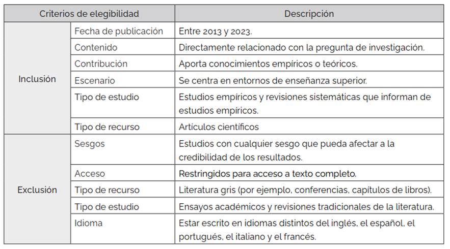 Esta revisión sistemática siguió el protocolo PRISMA (Page et al., 2021) para la búsqueda, cribado y selección de artículos. Además, se siguieron las indicaciones de Chigbu et al. (2023) para el procesamiento y el análisis de la bibliografía. Se establecieron criterios claros de inclusión y exclusión para el cribado. Dichos criterios se resumen en la Tabla 1.