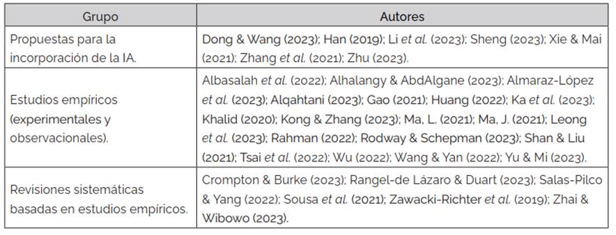 Los estudios se clasificaron principalmente en: los que describen propuestas y modelos (n = 7), estudios empíricos (n = 21) y revisiones sistemáticas que recopilan solo estudios empíricos (n = 5). La Tabla 2 los resume por grupo.