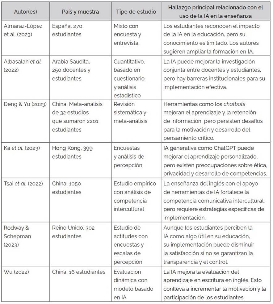 Tabla 3: Estudios con evidencia sobre el uso de la IA para la enseñanza desde diferentes perspectivas