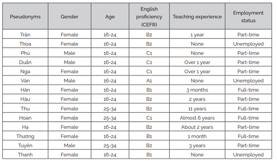 The course enrolled 15 student teachers, of whom 14 voluntarily agreed to participate in the study. These participants had teaching experience ranging from one month to over a year and expressed similar aspirations to pursue careers in language teaching post-graduation. Among them, 73.3% had more than one year of teaching experience, and 71.4% identified as female. In terms of age, 80% of participants were between 20 and 24 years old. Based on the Common European Framework of Reference for Languages (CEFR), 93.3% demonstrated intermediate-to-advanced English proficiency.
