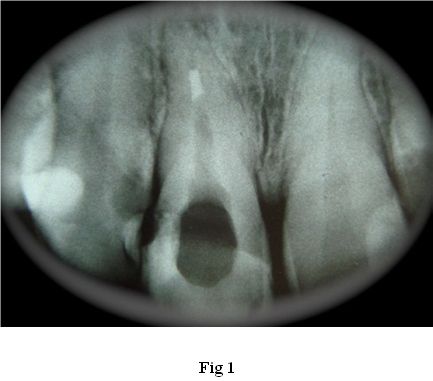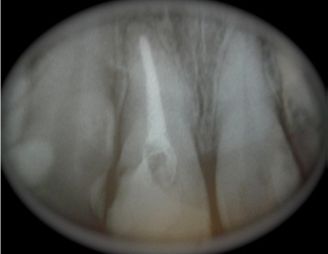 Al estudio RX se aprecia un conducto amplio, sobre todo en su tercio cervical con paredes bastante delgadas. (Fig. 1)